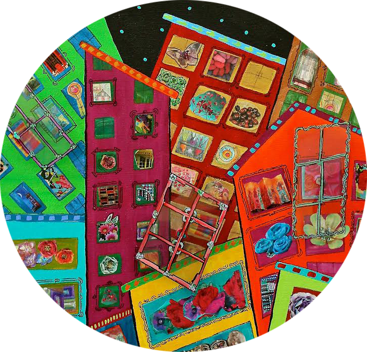 Throughout the many years that I have been creating art, I like to think that my creativity has evolved into “organized chaos”. I started designing handmade, whimsical greeting cards in my 20‘s. Soon after, a trip to Santa Fe introduced me to the look of painted furniture and I realized that I could combine my love for vibrant color and design in pieces which would become the focal point in any room. These commission-based works of art inhabit many homes in Pittsburgh. Combining my past techniques of playful, bold, eclectic art, I began experimenting on canvas which has culminated in my present creations. Using a combination of acrylics, decoupage, found 3-D objects, shadowboxes and miniatures, I’ve been able to throw together all of my art interests in each painting, which begs you to “Come closer” --- “Peek inside”. The common thread throughout each of these paintings is a glimpse into and out of the windows of this unusual, amusing, curious world we live in.